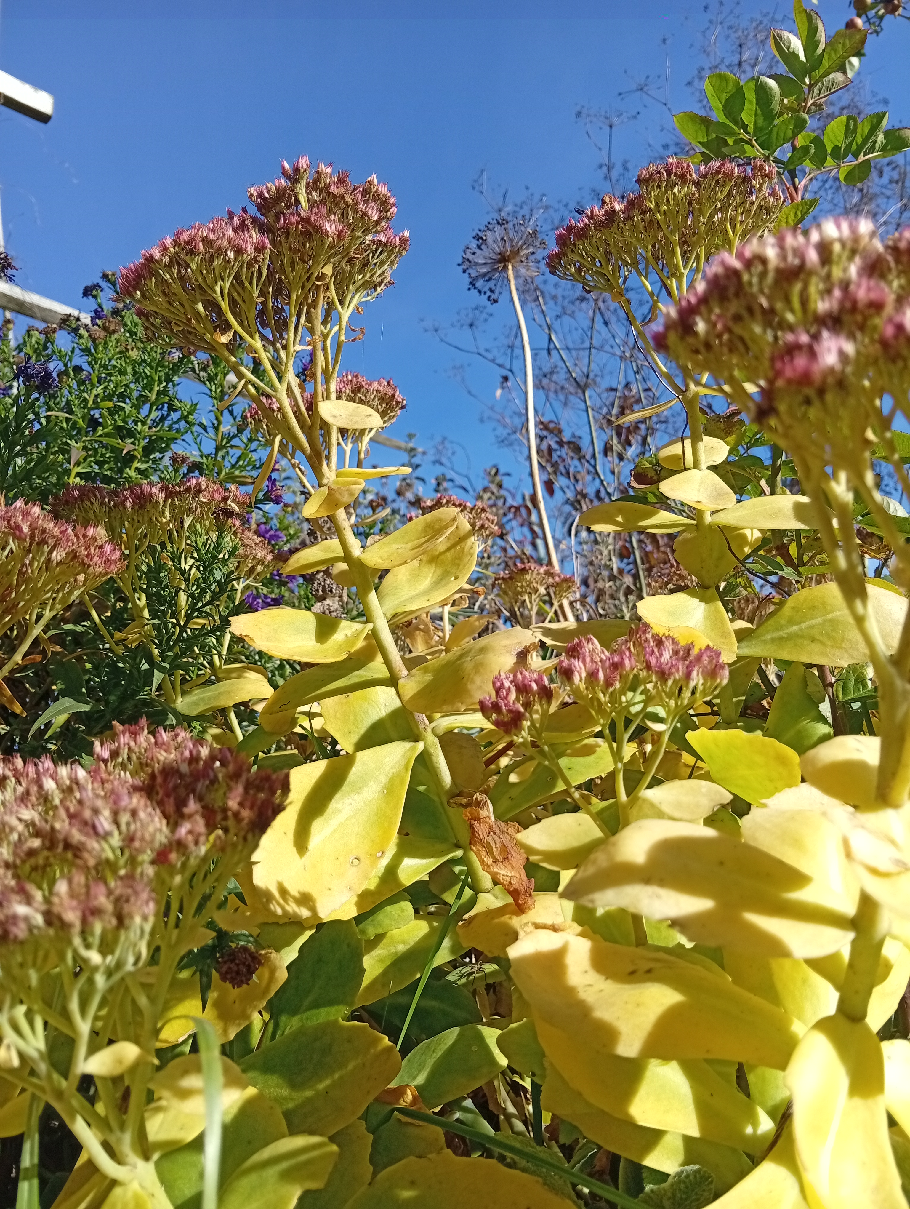 Slunce v záhonu, i když je zataženo a jejich odkvetlá květenství budou zdobit i v zimě. Třapatkám nachovým zůstaly místo květů už jen odkvetlý ježci, ale na podzim jsou jejich listy úchvatně oranžové!