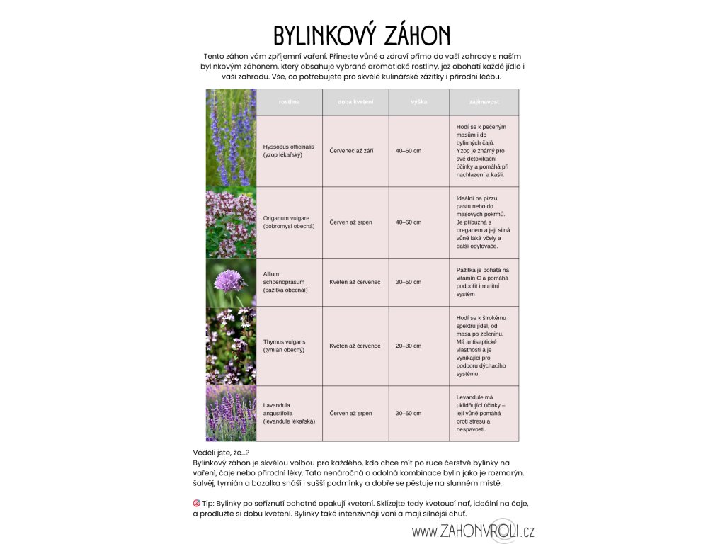 Přineste vůně a zdraví přímo do vaší zahrady s naším bylinkovým záhonem, který obsahuje vybrané aromatické rostliny, jež obohatí každé jídlo i vaši zahradu. Tento mix zahrnuje tymián obecný, dobromysl obecnou, pažitku, yzop lékařský a levanduli – vše, co potřebujete pro skvélé kulinářské zážitky i přírodní léčbu. Bylinky jsou ideální pro slunná stanoviště, snadno se pěstují a přitahují nejen člověka, ale i užitečný hmyz.
