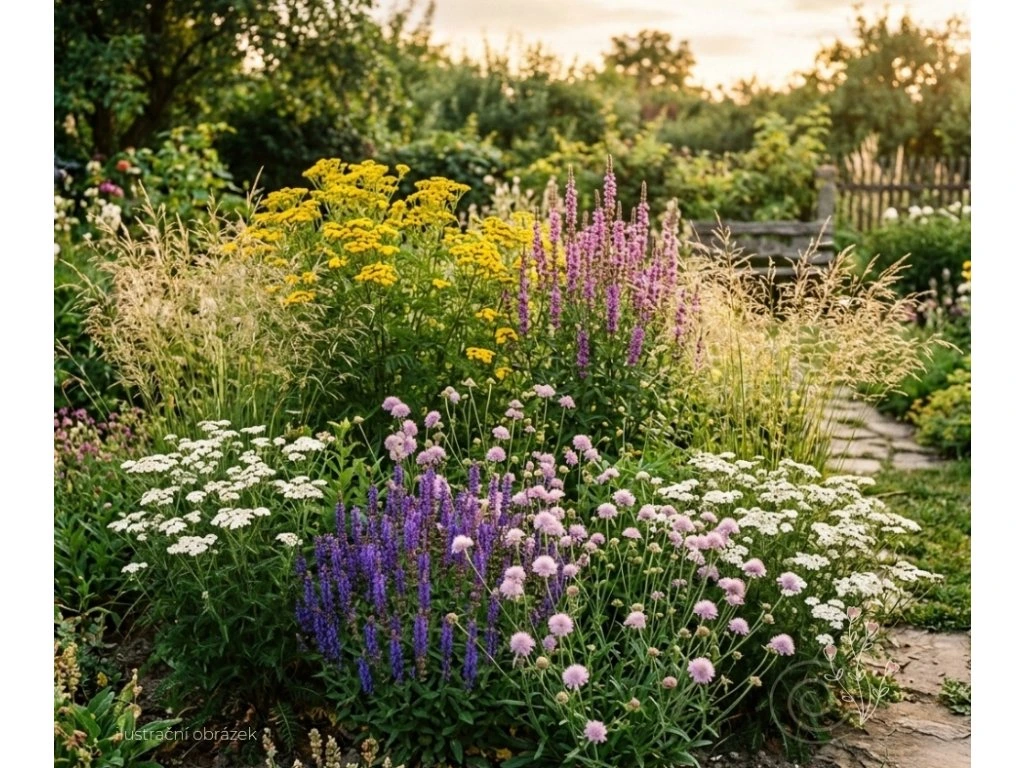 Přírodní trvalkový záhon z původních českých rostlin, který podporuje včely, motýly i další užitečný hmyz.